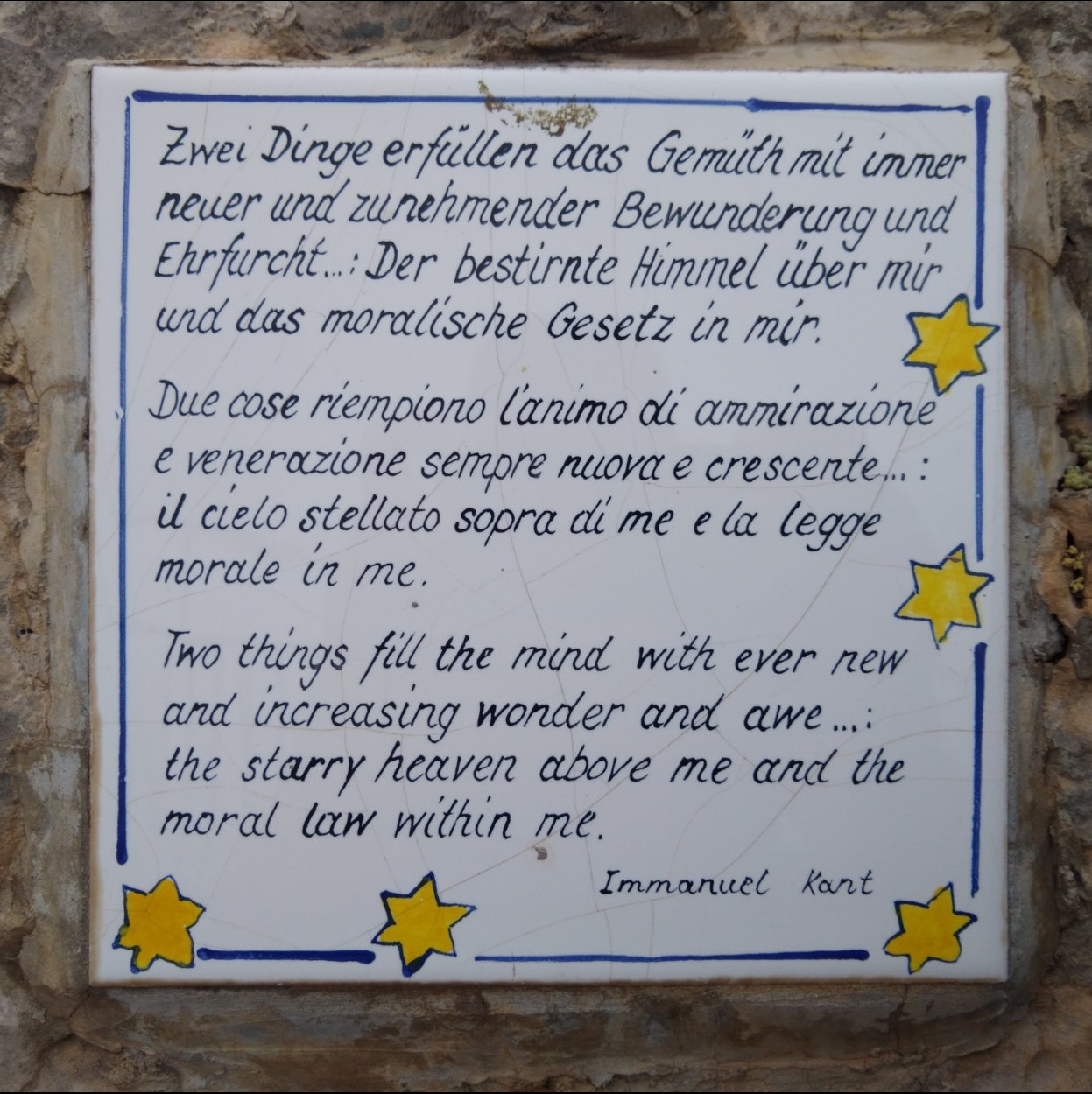 Due cose riempiono l'animo di ammirazione e venerazione sempre nuova e crescente…: il cielo stellato sopra di me e la legge morale in me